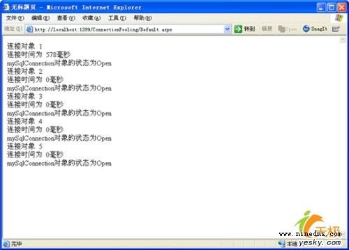 程序代码说明:在上述范例的程序代码中,我们将在连接池中重复5次打开一个SqlConnection对象,DateTime.Now表示当前的时间。timeTaken表示从连接开始到打开连接所用的时间间隔。可以看出,打开第一个连接的时间比打开后续连接的时间要长,因为第一个连接要实际连接数据库。被关闭之后,这个连接存放在连接池中。再次打开连接时,只要从池中直接读取即可,速度非常快。