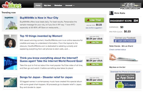 发布分析:一般人们都会比较讨厌那种付费点击广告,但是通过MyLikes,广告的发布频率会降低,而且曝光效果会得到改善,用户应该也一般不会因此而取消他们的关注对象。事实上MyLikes由于对Twitter用户采取了透明的收入分配政策,使得一部份名星也开始放弃使用Ad.ly的服务了。