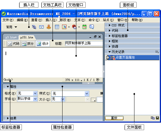 Dreamweaver MX 2004提供了多种此处未说明的其他面板、检查器和窗口。若要打开其它面板,请使用“窗口”菜单。