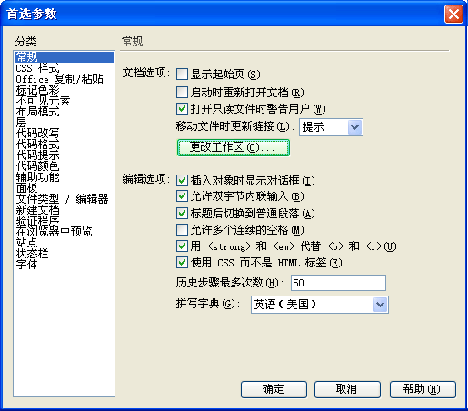 您可以从中选择一种工作区布局。如果您不熟悉编写代码,请您选择“设计者”。如果您以后想更改工作区,可以使用编辑菜单“首选参数”对话框切换到一种不同的工作区。编辑菜单“首选参数”对话框如下图: