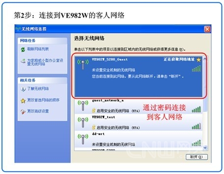 企业的客人打开笔记本电脑,搜索无线热点,就能发现飞鱼星VE982W有两个独立的无线热点,其中带"Guest"后缀的就是"客人网络"。