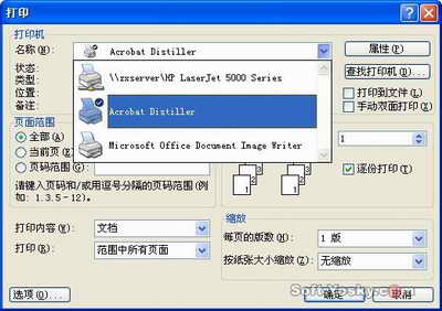 现在比较流行的DoctoPdf类软件如Pdfprint等的机理都是调用Adobe Distiller打印机实现的,如果想把一个Doc文件转换为Pdf文件,只要用Office Word打开该Doc文件,然后在“文件”—>“打印”中选择Acrobat Distiller打印机即可,如图2所示: