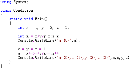 C#中唯一的一个三元操作符为:?:,即条件操作符。他要求每一个操作数都必须是一个可以隐式转换成bool类型的表达式,其运用形式如下: