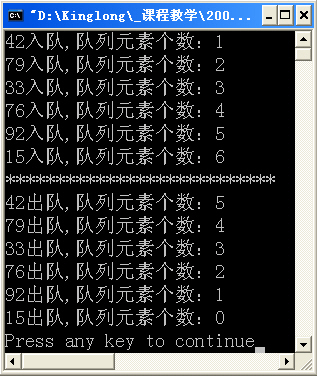 Console.WriteLine("{0}出队,队列元素个数:{1}",q.Out(),q.GetQueueLength());