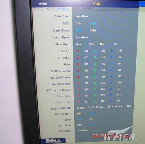 戴尔也是液晶市场中不可忽视的一只力量。戴尔液晶进入工厂模式需要按住“MENU”键和“+”,然后再按住“-”即可进入。以2407WFP-HC为例,工厂模式下提供了使用时间查询,色彩调整,甚至是灰阶6ms功能开启等选项。