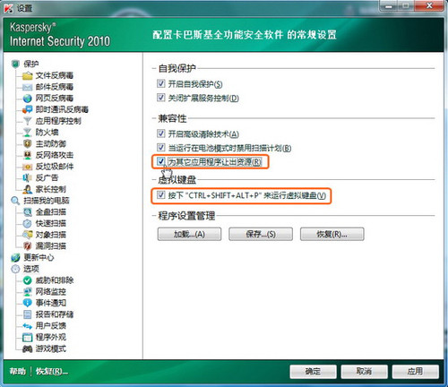 通过卡巴斯基设置面板内,设定“为其他应用程序让出资源”选项(图2),可以让用户在进行游戏的过程中更流畅。同时默认设置卡巴斯基2010会把“CTRL+SHIFT+ALT+P”作为虚拟键盘快捷键,方便用户调用。