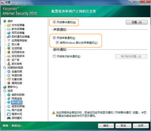 二、卡巴斯基游戏模式设置——关闭事件通知与静提示音