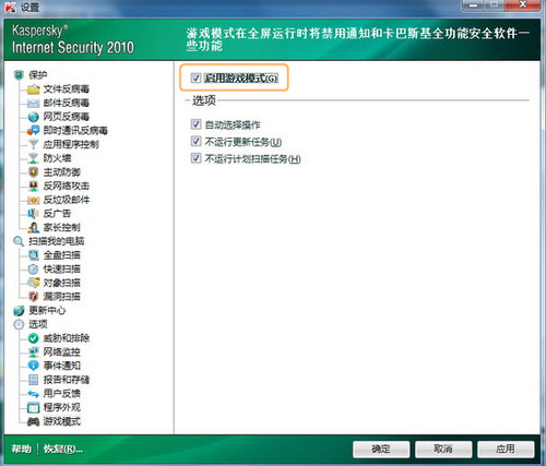卡巴斯基杀毒软件以专业的杀毒技术在中国累积了大量用户,卡巴斯基2010版特地为游戏玩家设计了“游戏模式”,用户开启卡巴斯基“游戏模式”,卡巴斯基将会运行相应的规则,让用户免受干扰,这部分规则,基本都是针对全屏模式游戏进行的静默操作。