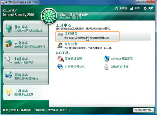 无论玩什么游戏,需要养成用卡巴斯基内带的虚拟键盘输入密码(图1)。经过卡巴斯基2010虚拟键盘技术保护,能够有效防范键盘记录器,截图器等工具的密码盗窃行为。