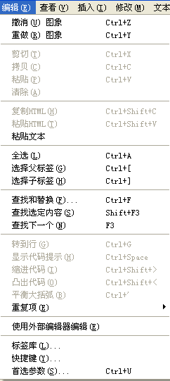 “编辑”菜单 包含选择和搜索ming令,例如“选择父标签”和“查找和替换”。“编辑”菜单还提供对DW菜单中“首选参数”的访问。 |