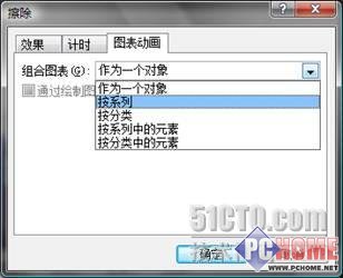 如果希望该图表以“序列”的方式在播放中的出现,那么可以点击“幻灯片动画”窗ge中的代表Excel图表的“擦除”动画右侧箭头,选择菜单中的【效果选项】命令,在弹出的对话框中单击【图表动画】选项卡,其中的【组合图表】选项菜单中一般会有以下5种选择,你可以任选一种,指定图表的动画方式即可: