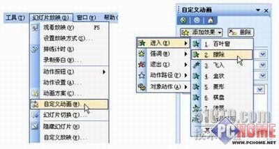 打开包含图表的幻灯片,选择【幻灯片放映】菜单中的【自定义动画】。单击幻灯片中的折线图,在【自定义动画】工具栏中选择【添加效果】|【进入】|【擦除】(在此以“擦除”动画效果为例)。这样当前的折线图就以一个整体图表按照擦除的效果出现在幻灯片的播放中。