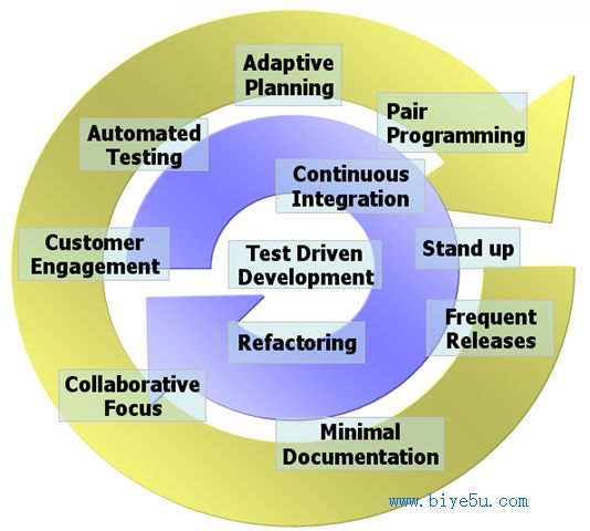 (9)Customer Engagement ,现场客户。敏捷开发中,客户是与开发团队一起工作的,团队到客户现场进行开发或者邀请客户到团队公司里来开发。如果开发过程中有什么问题或者产品经过一个迭代后,能够以最快速度得到客户的反馈。